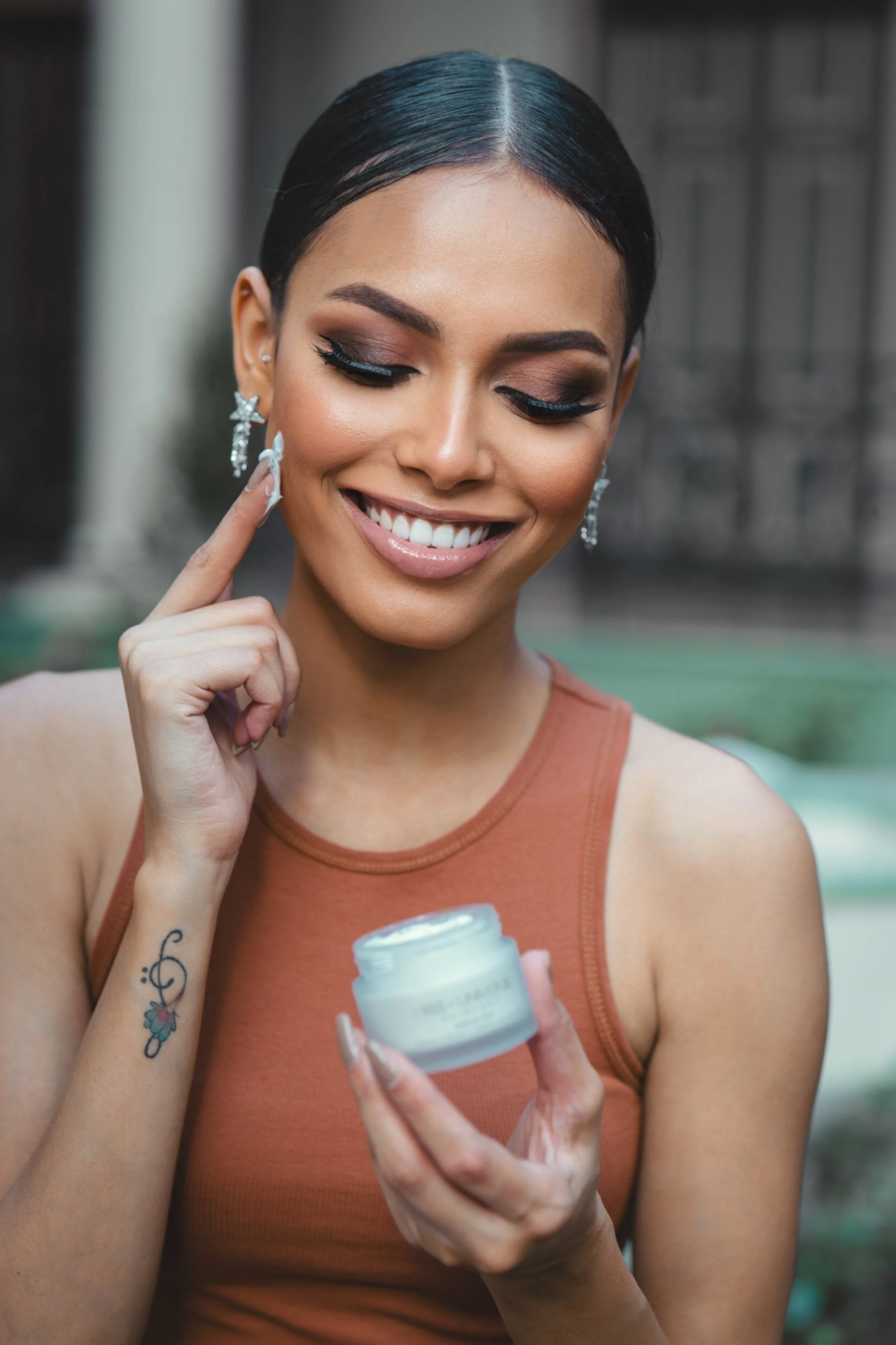 Une femme souriante utilisant une crème pour le visage.